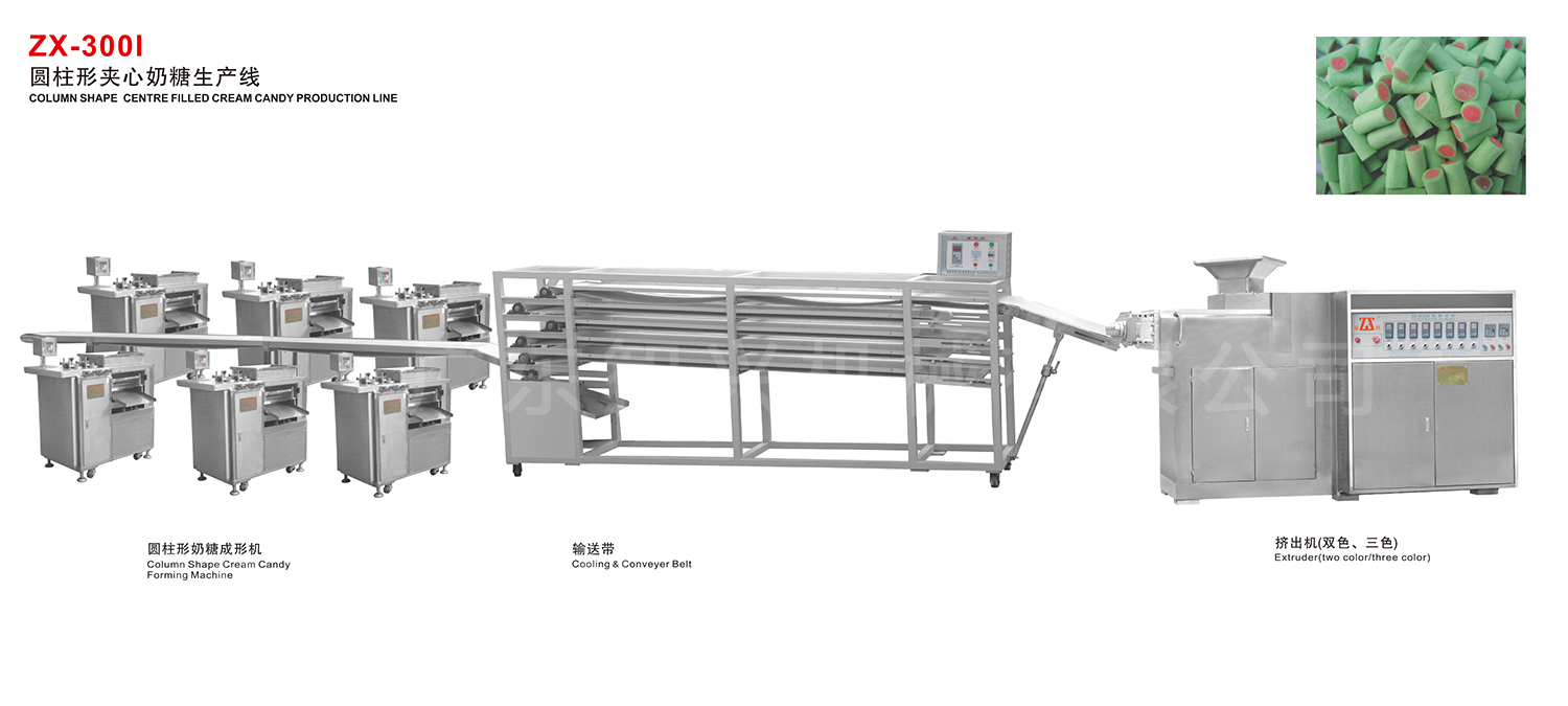 該生產(chǎn)線適用于奶糖、泡泡糖的成形生產(chǎn),具有生產(chǎn)效率高、次糖少的優(yōu)點。